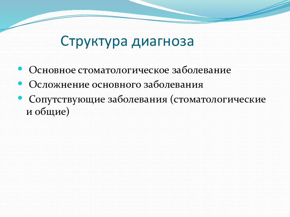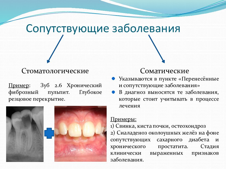 Стоматологические Пример : Зуб 2.6 Хронический фиброзный пульпит. Глубокое резцовое перекрытие. Соматические Указываются в пункте «Перенесённые и сопутствующие заболевания» В диагноз выносятся те заболевания, которые стоит учитывать в процессе лечения Примеры: 1) Свинка, киста почки, остеохондроз 2) Сиаладеноз околоушных желёз на фоне сопутствующих сахарного диабета и хронического простатита. Стадия клинически выраженных признаков заболевания.