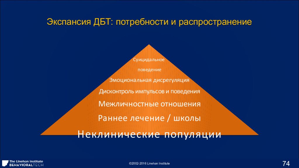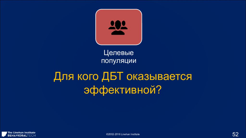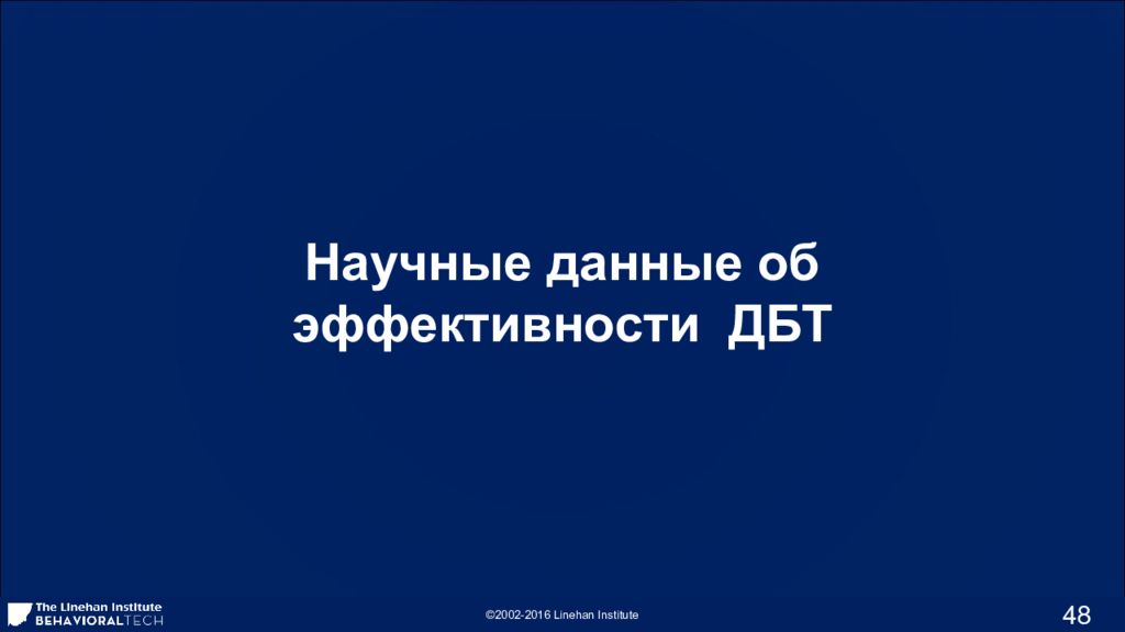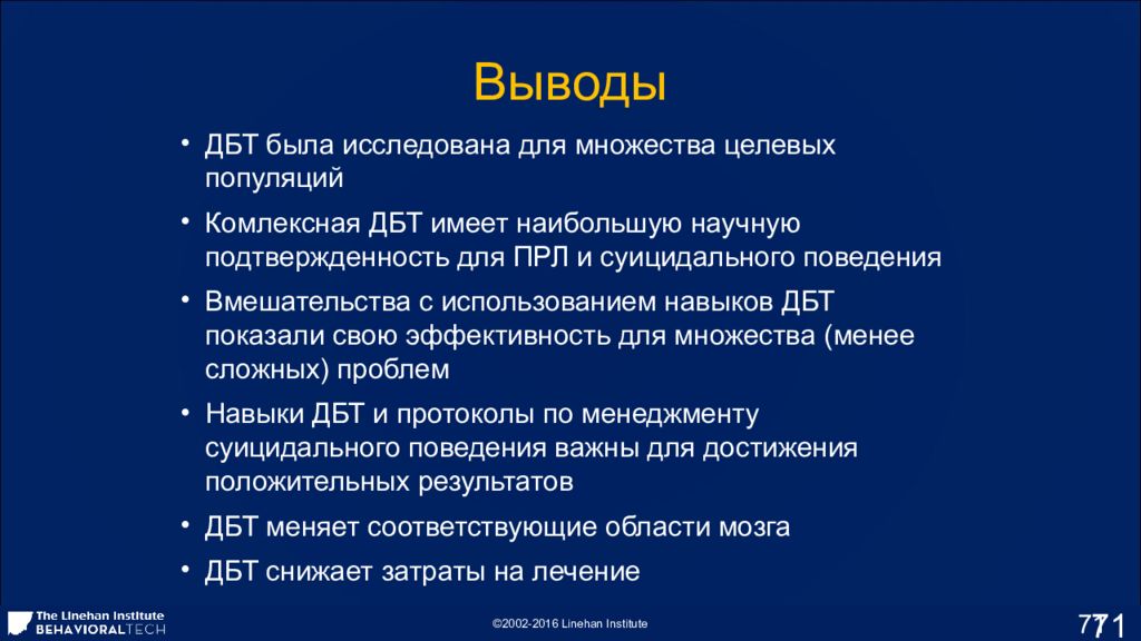 ДБТ была исследована для множества целевых популяций Комлексная ДБТ имеет наибольшую научную подтвержденность для ПРЛ и суицидального поведения Вмешательства с использованием навыков ДБТ показали свою эффективность для множества (менее сложных) проблем Навыки ДБТ и протоколы по менеджменту суицидального поведения важны для достижения положительных результатов ДБТ меняет соответствующие области мозга ДБТ снижает затраты на лечение Выводы