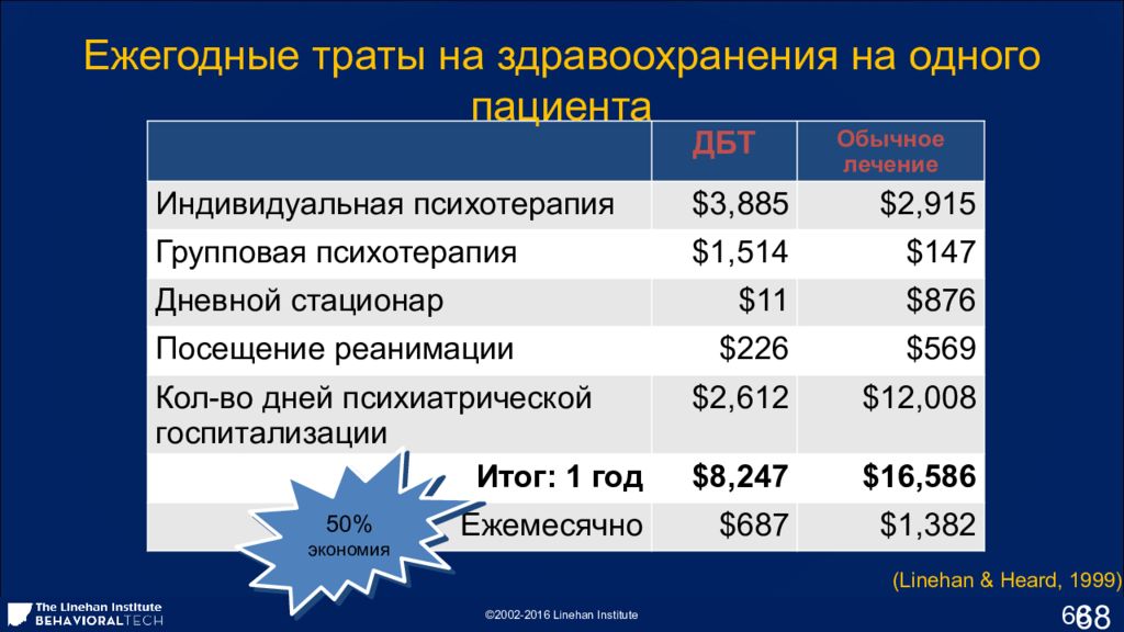 ДБТ Обычное лечение Индивидуальная психотерапия $3,885 $2,915 Групповая психотерапия $1,514 $147 Дневной стационар $11 $876 Посещение реанимации $226 $569 Кол-во дней психиатрической госпитализации $2,612 $12,008 Итог : 1 год $8,247 $16,586 Ежемесячно $687 $1,382 Ежегодные траты на здравоохранения на одного пациента (Linehan & Heard, 1999) 50% экономия
