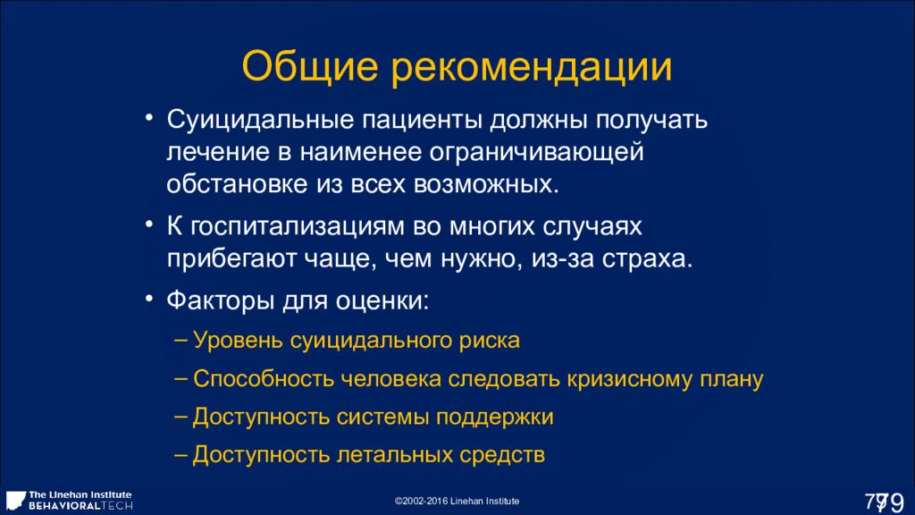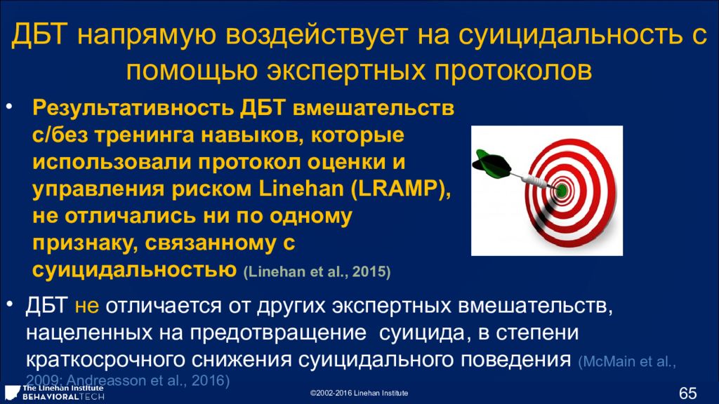 ДБТ не отличается от других экспертных вмешательств, нацеленных на предотвращение суицида, в степени краткосрочного снижения суицидального поведения ( McMain et al., 2009; Andreasson et al., 2016) Результативность ДБТ вмешательств с/без тренинга навыков, которые использовали протокол оценки и управления риском Linehan (LRAMP), не отличались ни по одному признаку, связанному с суицидальностью ( Linehan et al., 2015)