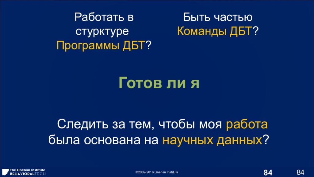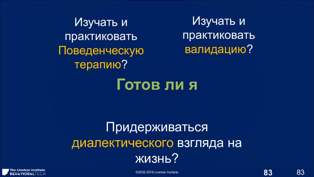Изучать и практиковать Поведенческую терапию ? Изучать и практиковать валидацию ? Готов ли я Придерживаться диалектического взгляда на жизнь ? 83