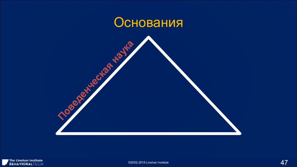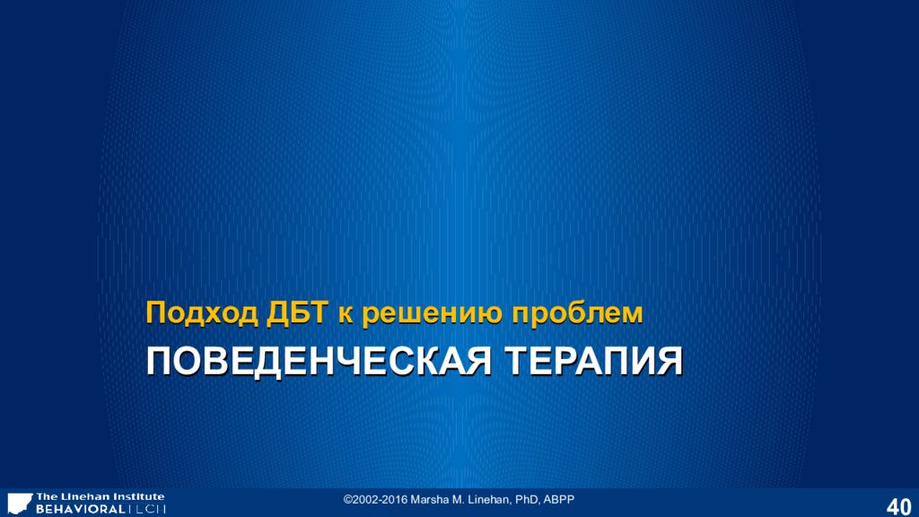 Основан на принципах научения Принципы поведения систематически применяются к задачам по изменению своего или чьего-то еще поведения ДБТ Подход к решению проблем Больше поведения, которого хотим Меньше поведения, которого не хотим