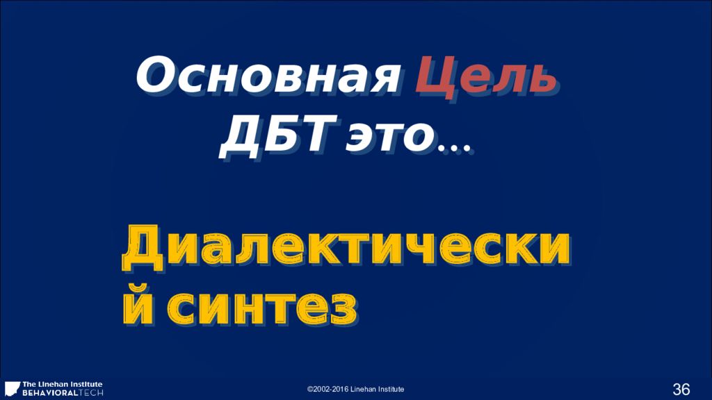 Синтез : Изменений и принятия Широта сознания : «Танец» с движением, скоростью и плавностью Радикальное принятие : Низкого, эпизодического темпа прогресса Риска суицида Скромность: Признание обоюдности психотерапии