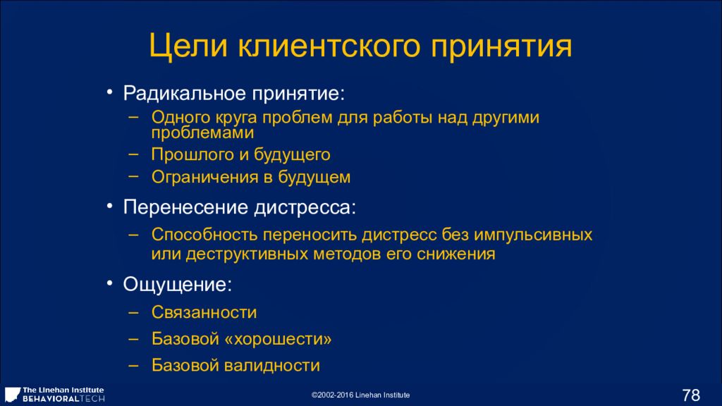 Радикальное принятие : Одного круга проблем для работы над другими проблемами Прошлого и будущего Ограничения в будущем Перенесение дистресса : Способность переносить дистресс без импульсивных или деструктивных методов его снижения Ощущение : Связанности Базовой «хорошести» Базовой валидности