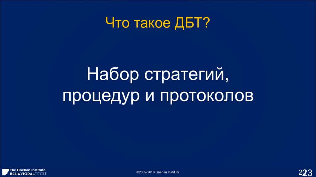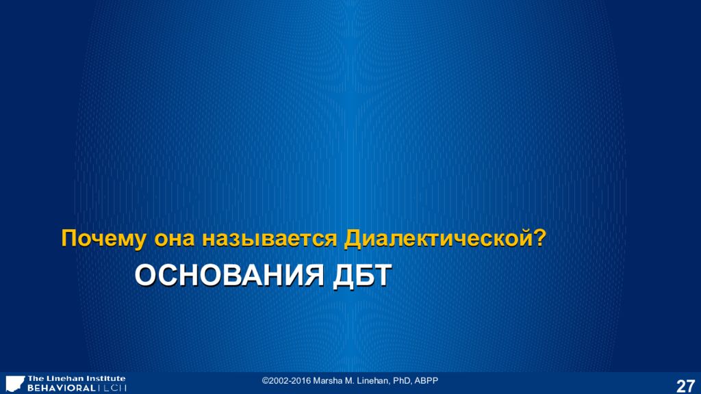 Диалектики Управление делами ДБТ ® Стратегии Решение проблем Валидация Командные консультации Провокативность ( Irreverence ) Взаимность ( Reciprocity ) Изменение Принятие Консультации клиента Интервенции в окружении