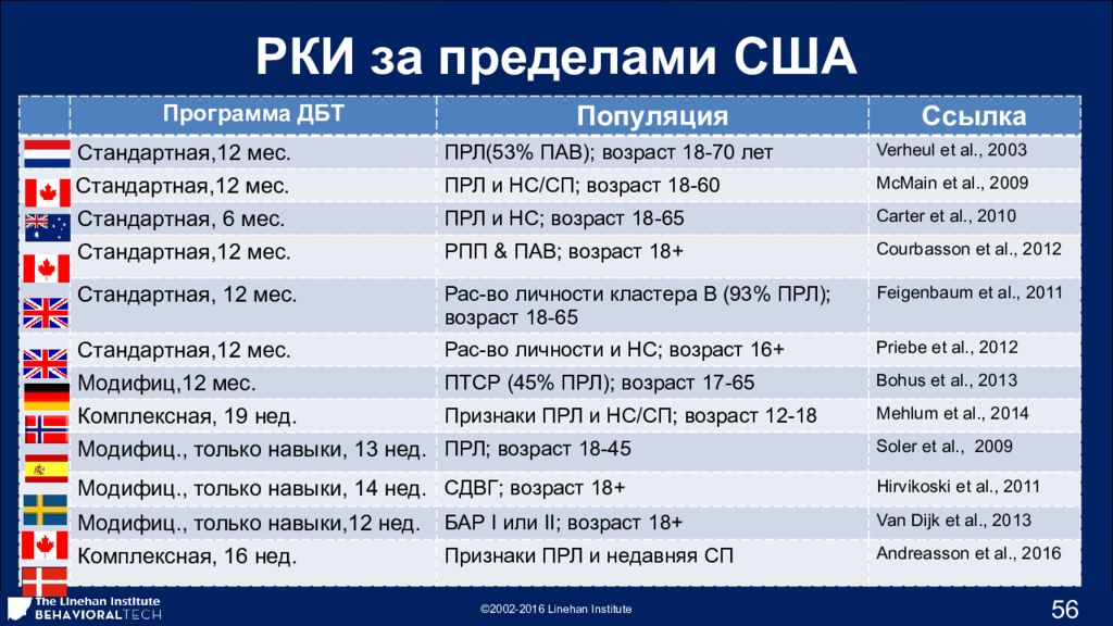 Программа ДБТ Популяция Ссылка Стандартная, 12 мес. ПРЛ (53% ПАВ ); возраст 18-70 лет Verheul et al., 2003 Стандартная, 12 мес. ПРЛ и НС / СП ; возраст 18-60 McMain et al., 2009 Стандартная, 6 мес. ПРЛ и НС ; возраст 18-65 Carter et al., 2010 Стандартная, 12 мес. РПП & ПАВ ; возраст 18 + Courbasson et al., 2012 Стандартная, 12 мес. Рас-во личности кластера B (93% ПРЛ ); возраст 18-65 Feigenbaum et al., 2011 Стандартная, 12 мес. Рас-во личности и НС ; возраст 16 + Priebe et al., 2012 Модифиц, 12 мес. ПТСР (45% ПРЛ ); возраст 17-65 Bohus et al., 2013 Комплексная, 19 нед. Признаки ПРЛ и НС/СП ; возраст 12-18 Mehlum et al., 2014 Модифиц., только навыки, 13 нед. ПРЛ ; возраст 18-45 Soler et al., 2009 Модифиц., только навыки, 14 нед. СДВГ ; возраст 18 + Hirvikoski et al., 2011 Модифиц., только навыки,12 нед. БАР I или II; возраст 18 + Van Dijk et al., 2013 Комплексная, 16 нед. Признаки ПРЛ и недавняя СП Andreasson et al., 2016