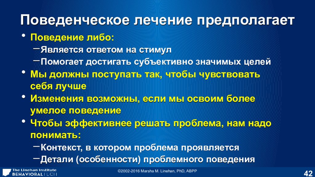 Поведение либо : Является ответом на стимул Помогает достигать субъективно значимых целей Мы должны поступать так, чтобы чувствовать себя лучше Изменения возможны, если мы освоим более умелое поведение Чтобы эффективнее решать проблема, нам надо понимать : Контекст, в котором проблема проявляется Детали (особенности) проблемного поведения Поведенческое лечение предполагает