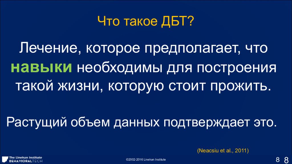 Лечение, которое предполагает, что навыки необходимы для построения такой жизни, которую стоит прожить. Растущий объем данных подтверждает это. (Neacsiu et al., 2011)