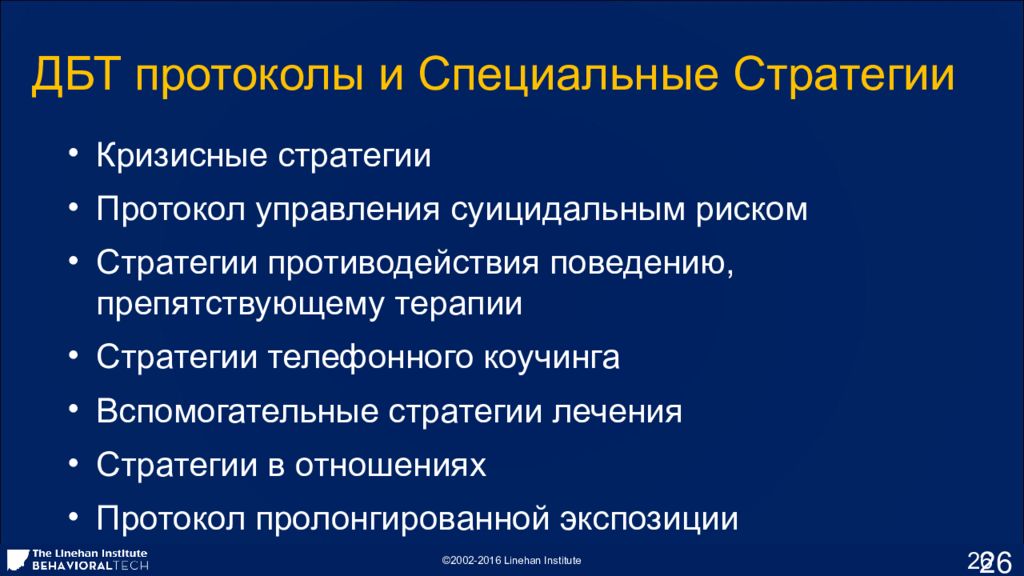 Кризисные стратегии Протокол управления суицидальным риском Стратегии противодействия поведению, препятствующему терапии Стратегии телефонного коучинга Вспомогательные стратегии лечения Стратегии в отношениях Протокол пролонгированной экспозиции