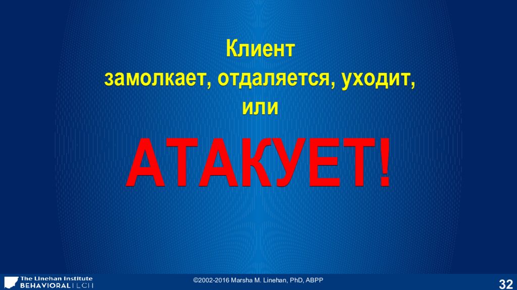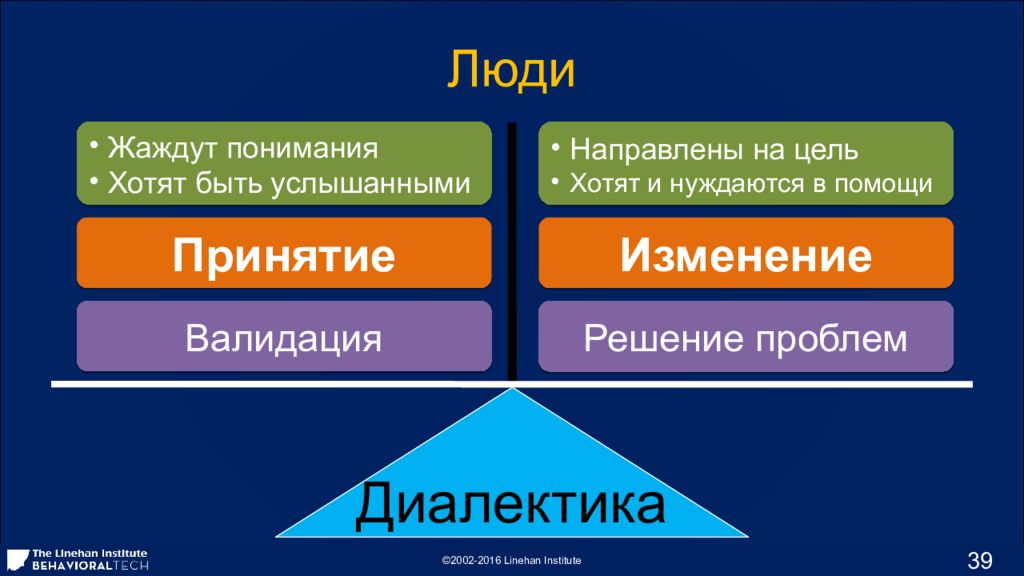Жаждут понимания Хотят быть услышанными Направлены на цель Хотят и нуждаются в помощи Принятие Изменение Валидация Решение проблем Диалектика
