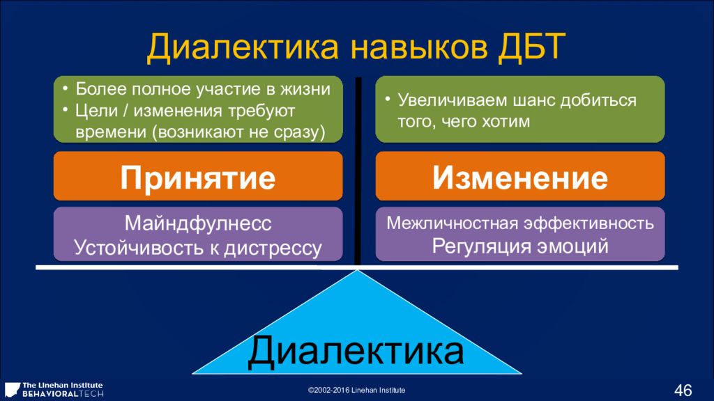 Более полное участие в жизни Цели / изменения требуют времени (возникают не сразу) Увеличиваем шанс добиться того, чего хотим Принятие Изменение Майндфулнесс Устойчивость к дистрессу Межличностная эффективность Регуляция эмоций Диалектика