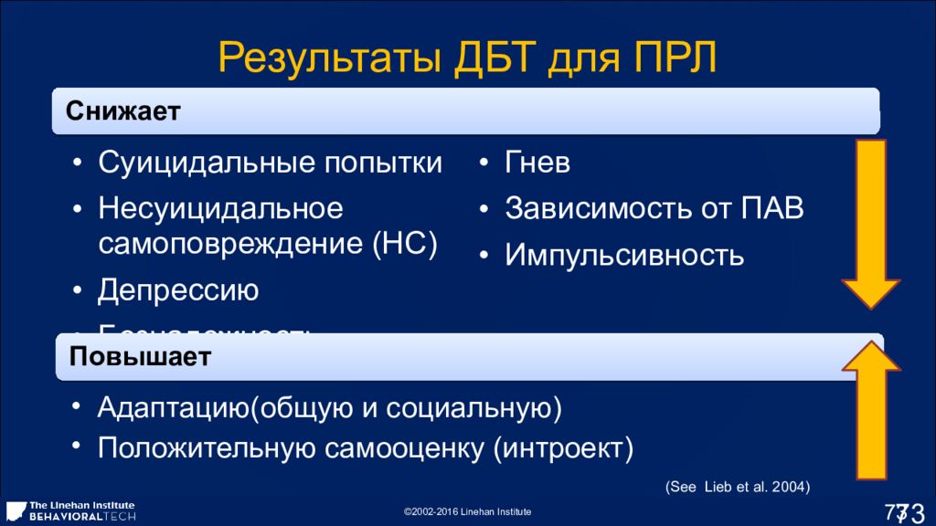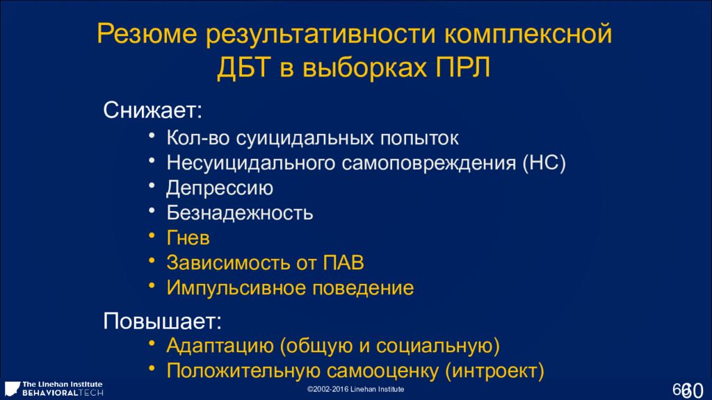 Снижает : Кол-во суицидальных попыток Несуицидального самоповреждения (НС) Депрессию Безнадежность Гнев Зависимость от ПАВ Импульсивное поведение Повышает : Адаптацию (общую и социальную) Положительную самооценку ( интроект ) Резюме результативности комплексной ДБТ в выборках ПРЛ