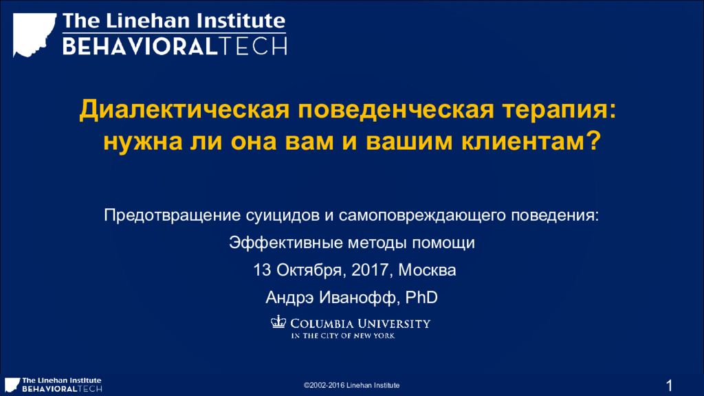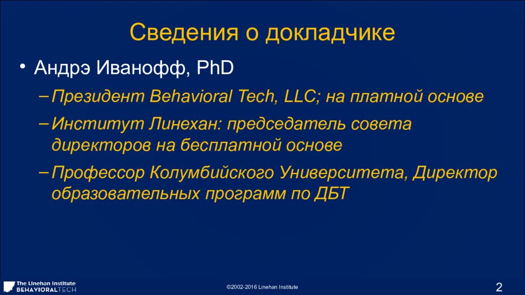 Андрэ Иванофф, PhD Президент Behavioral Tech, LLC; на платной основе Институт Линехан: председатель совета директоров на бесплатной основе Профессор Колумбийского Университета, Директор образовательных программ по ДБТ