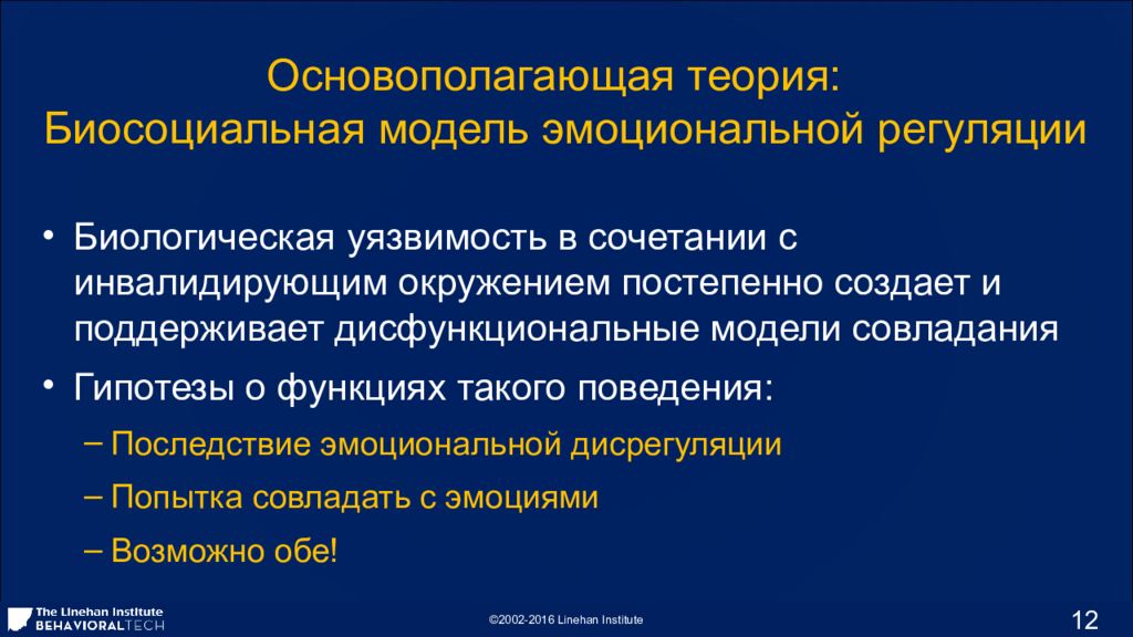 Слайд 12: Основополагающая теория : Биосоциальная модель эмоциональной регуляции