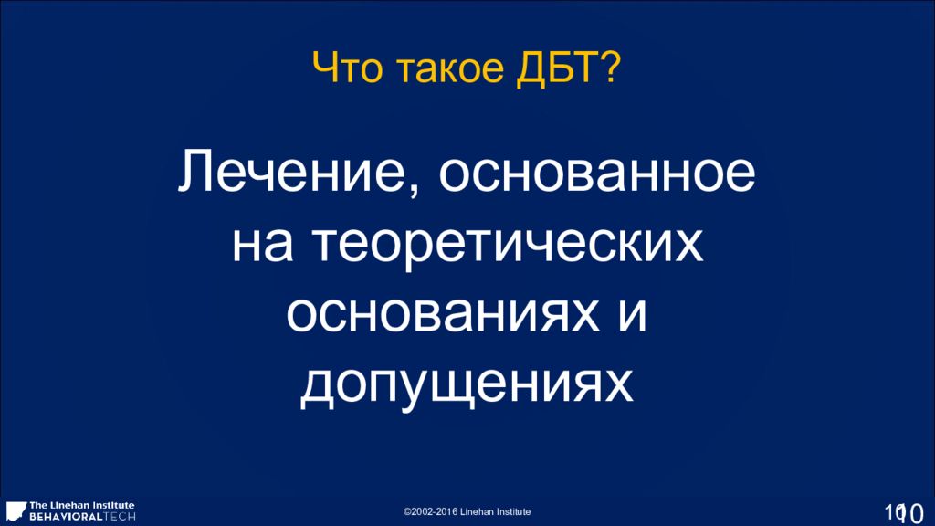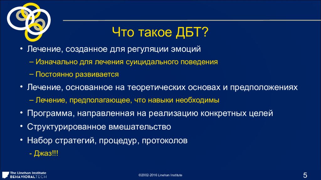 Что такое ДБТ ? Лечение, созданное для регуляции эмоций Изначально для лечения суицидального поведения Постоянно развивается Лечение, основанное на теоретических основах и предположениях Лечение, предполагающее, что навыки необходимы Программа, направленная на реализацию конкретных целей Структурированное вмешательство Набор стратегий, процедур, протоколов - Джаз !!!
