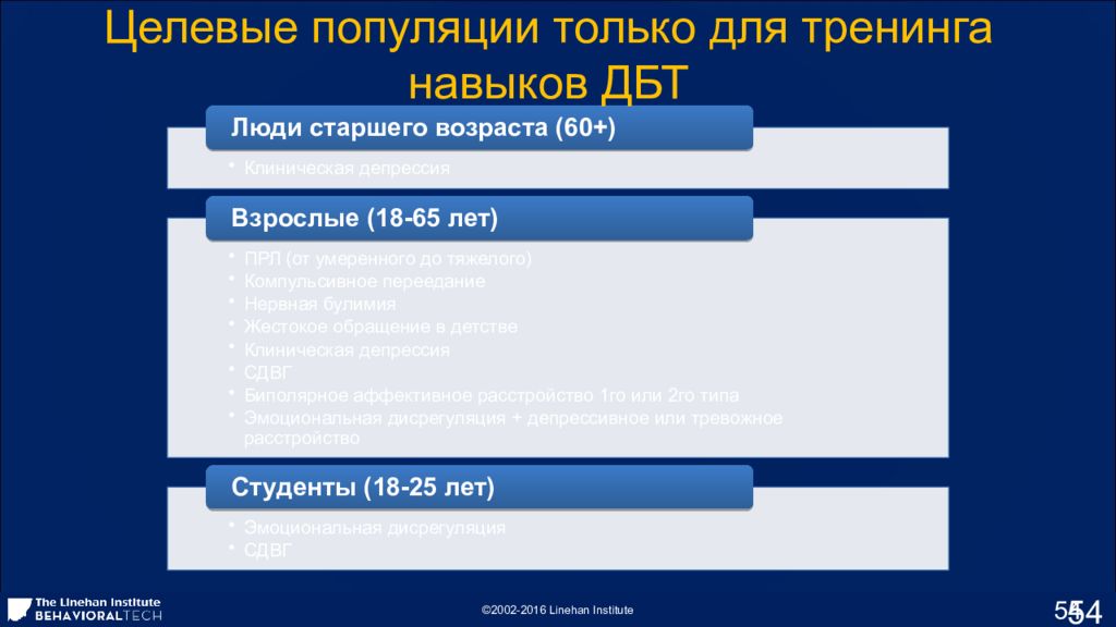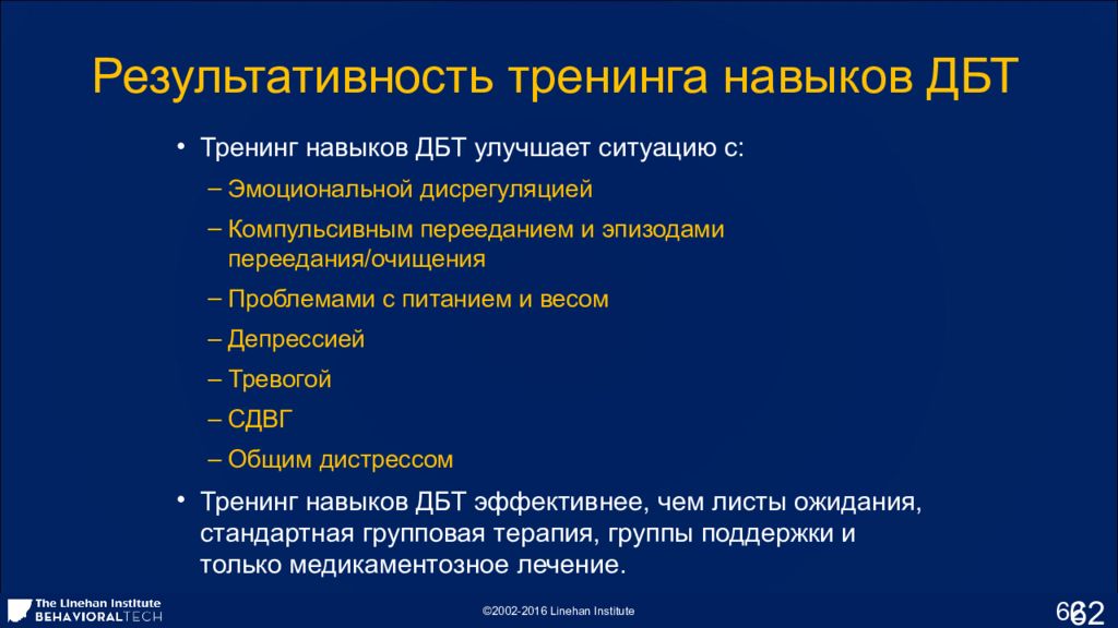 Тренинг навыков ДБТ улучшает ситуацию с : Эмоциональной дисрегуляцией Компульсивным перееданием и эпизодами переедания/очищения Проблемами с питанием и весом Депрессией Тревогой СДВГ Общим дистрессом Тренинг навыков ДБТ эффективнее, чем листы ожидания, стандартная групповая терапия, группы поддержки и только медикаментозное лечение. Результативность тренинга навыков ДБТ