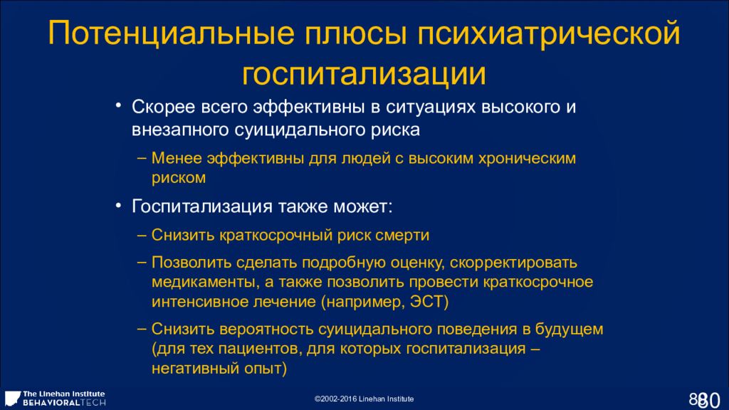 Слайд 80: Потенциальные плюсы психиатрической госпитализации