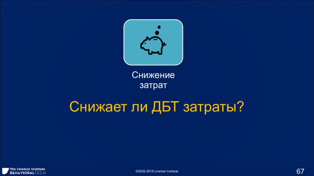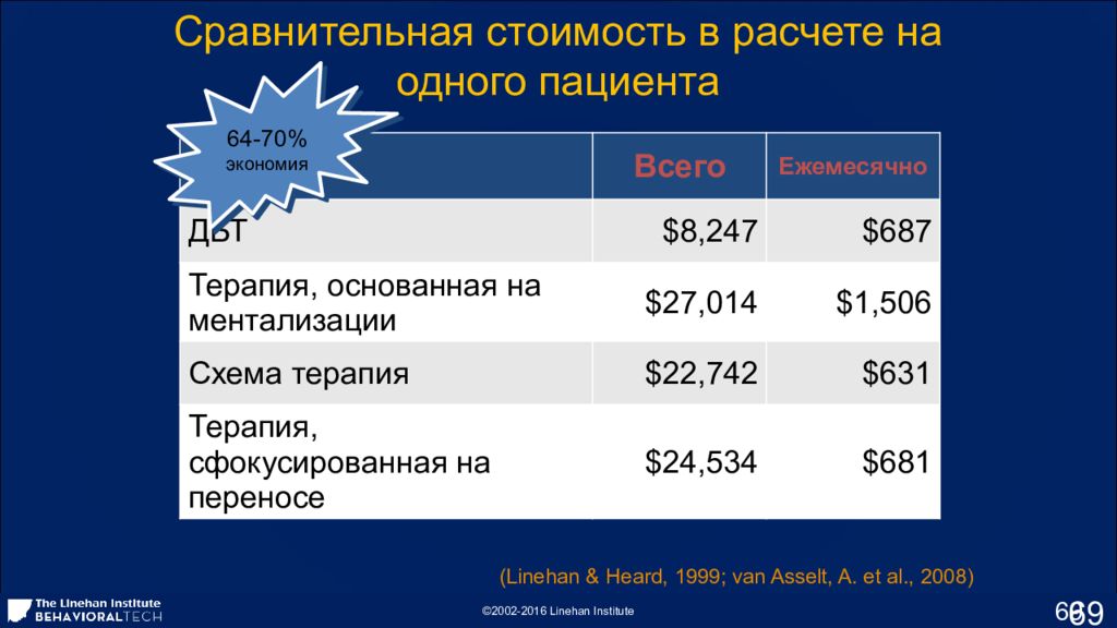 Всего Ежемесячно ДБТ $8,247 $687 Терапия, основанная на ментализации $27,014 $1,506 Схема терапия $22,742 $631 Терапия, сфокусированная на переносе $24,534 $681 Сравнительная стоимость в расчете на одного пациента ( Linehan & Heard, 1999; van Asselt, A. et al., 2008) 64-70% экономия