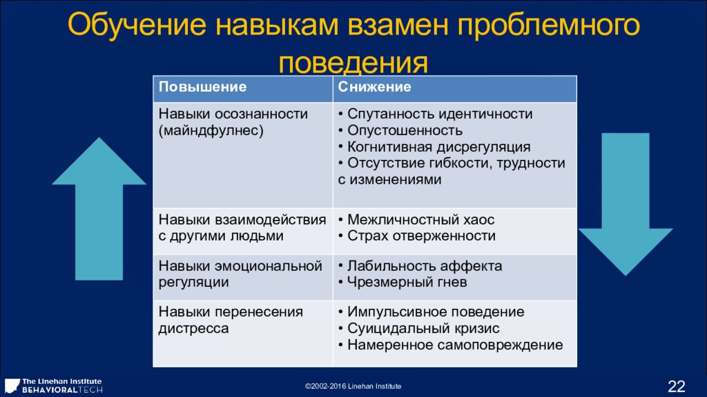Повышение Снижение Навыки осознанности ( майндфулнес ) Спутанность идентичности Опустошенность Когнитивная дисрегуляция Отсутствие гибкости, трудности с изменениями Навыки взаимодействия с другими людьми Межличностный хаос Страх отверженности Навыки эмоциональной регуляции Лабильность аффекта Чрезмерный гнев Навыки перенесения дистресса Импульсивное поведение Суицидальный кризис Намеренное самоповреждение