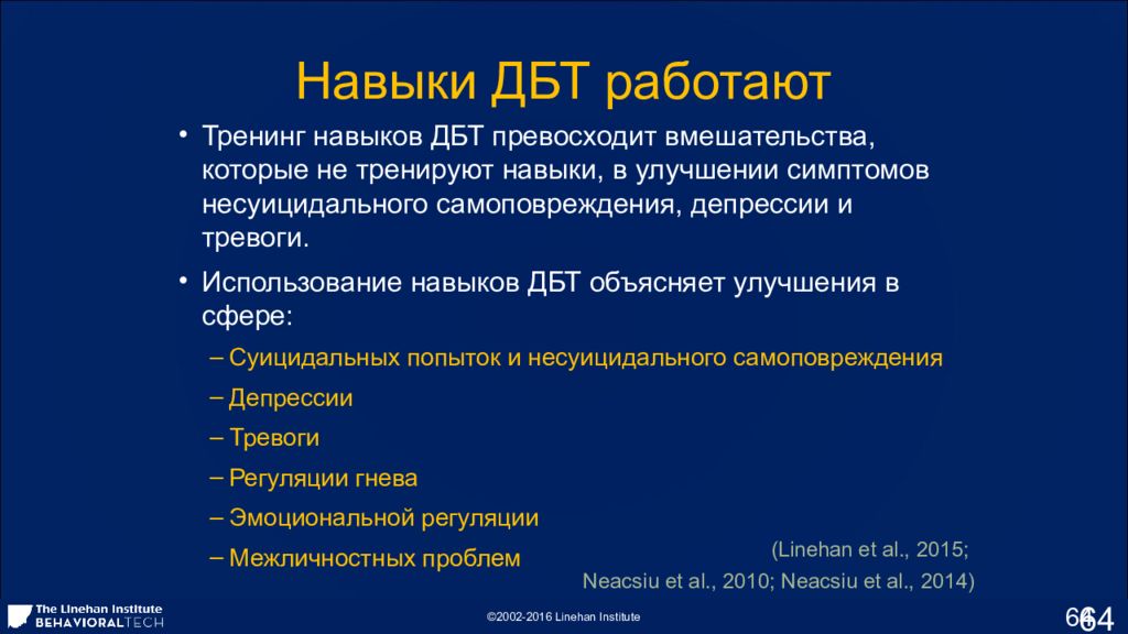 Тренинг навыков ДБТ превосходит вмешательства, которые не тренируют навыки, в улучшении симптомов несуицидального самоповреждения, депрессии и тревоги. Использование навыков ДБТ объясняет улучшения в сфере : Суицидальных попыток и несуицидального самоповреждения Депрессии Тревоги Регуляции гнева Эмоциональной регуляции Межличностных проблем Навыки ДБТ работают ( Linehan et al., 2015; Neacsiu et al., 2010; Neacsiu et al., 2014)