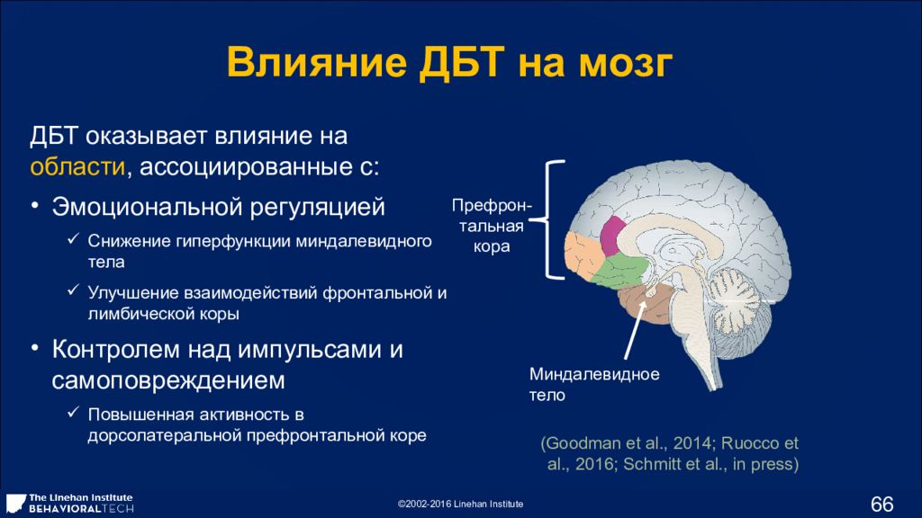 ДБТ оказывает влияние на области, ассоциированные с: Эмоциональной регуляцией Снижение гиперфункции миндалевидного тела Улучшение взаимодействий фронтальной и лимбической коры Контролем над импульсами и самоповреждением Повышенная активность в дорсолатеральной префронтальной коре (Goodman et al., 2014; Ruocco et al., 2016; Schmitt et al., in press) Миндалевидное тело Префрон-тальная кора