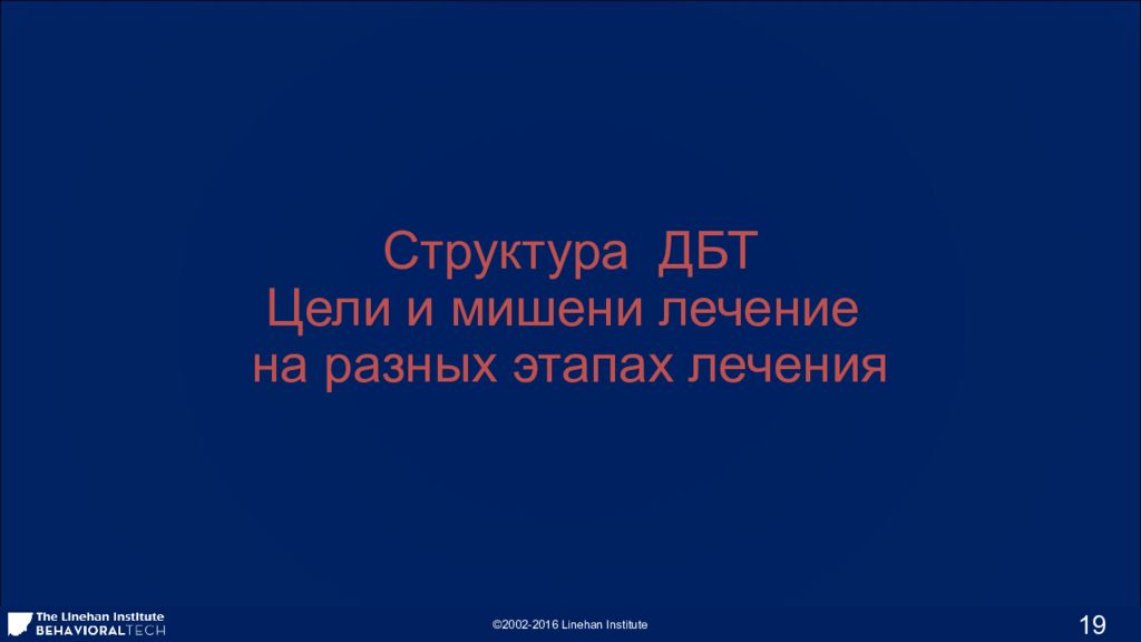 Угрожающее жизни поведение Поведение, мешающее терапии Поведение, снижающее качество жизни Снизить поведенческие нарушения Базовая осознанность ( mindfulness ) Переносимость дистресса Межличностная эффективность Эмоциональная регуляция Самоуправление Укрепить поведенческие навыки Тяжелые поведенческие нарушения Контроль над поведением