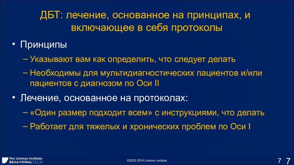 Принципы Указывают вам как определить, что следует делать Необходимы для мультидиагностических пациентов и/или пациентов с диагнозом по Оси II Лечение, основанное на протоколах : «Один размер подходит всем» с инструкциями, что делать Работает для тяжелых и хронических проблем по Оси I