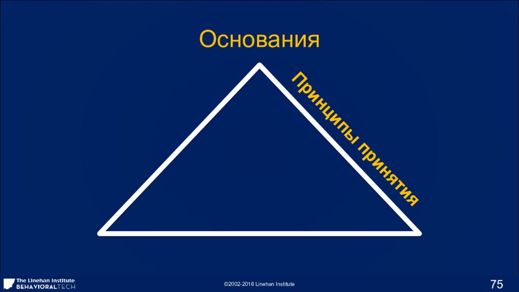 Цель психотерапии – изменения Для изменений необходимо принятие Принятие одной группы проблем для работы над другой группой проблем Радикальное принятие прошлого и реалистичных ограничений в будущем Принятие и психотерапия