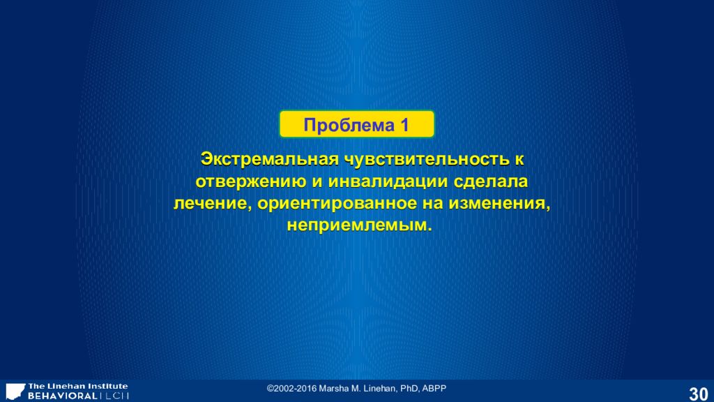 Экстремальная чувствительность к отвержению и инвалидации сделала лечение, ориентированное на изменения, неприемлемым. Проблема 1