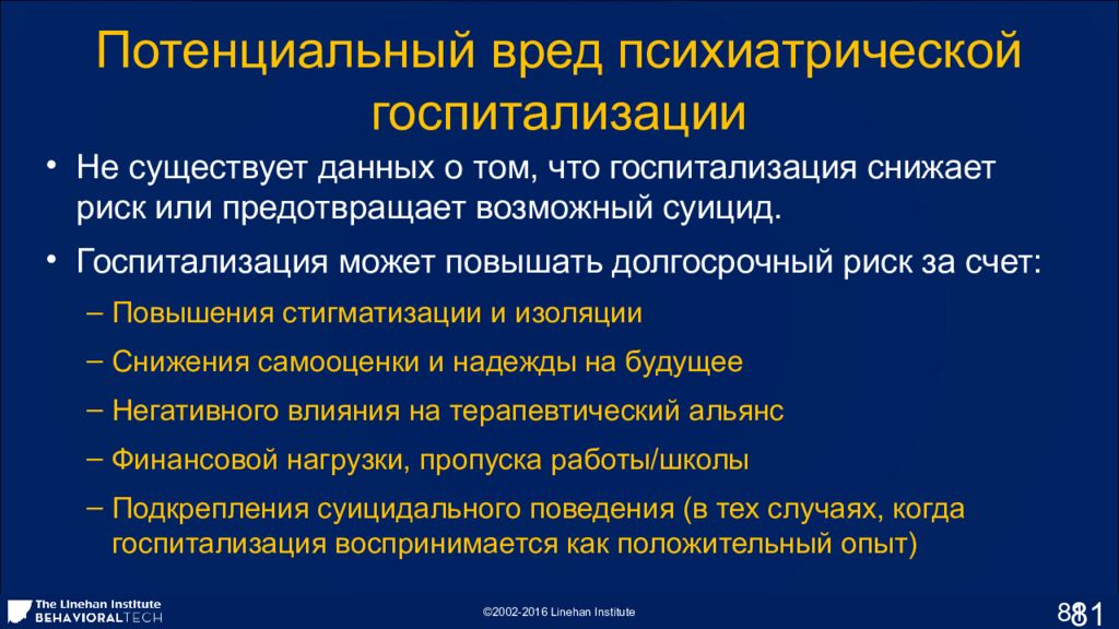 Слайд 81: Потенциальный вред психиатрической госпитализации