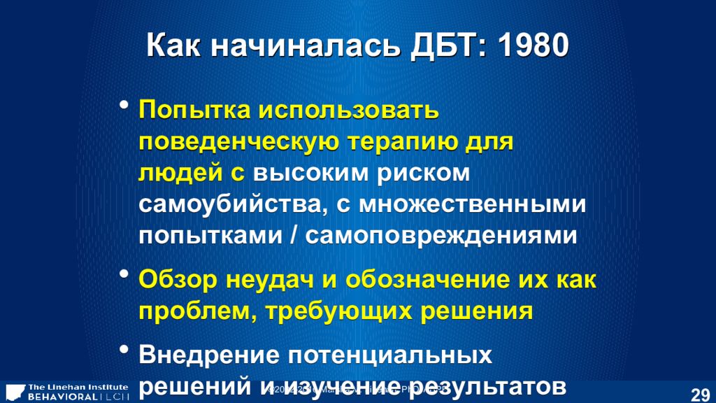 Попытка использовать поведенческую терапию для людей с высоким риском самоубийства, с множественными попытками / самоповреждениями Обзор неудач и обозначение их как проблем, требующих решения Внедрение потенциальных решений и изучение результатов