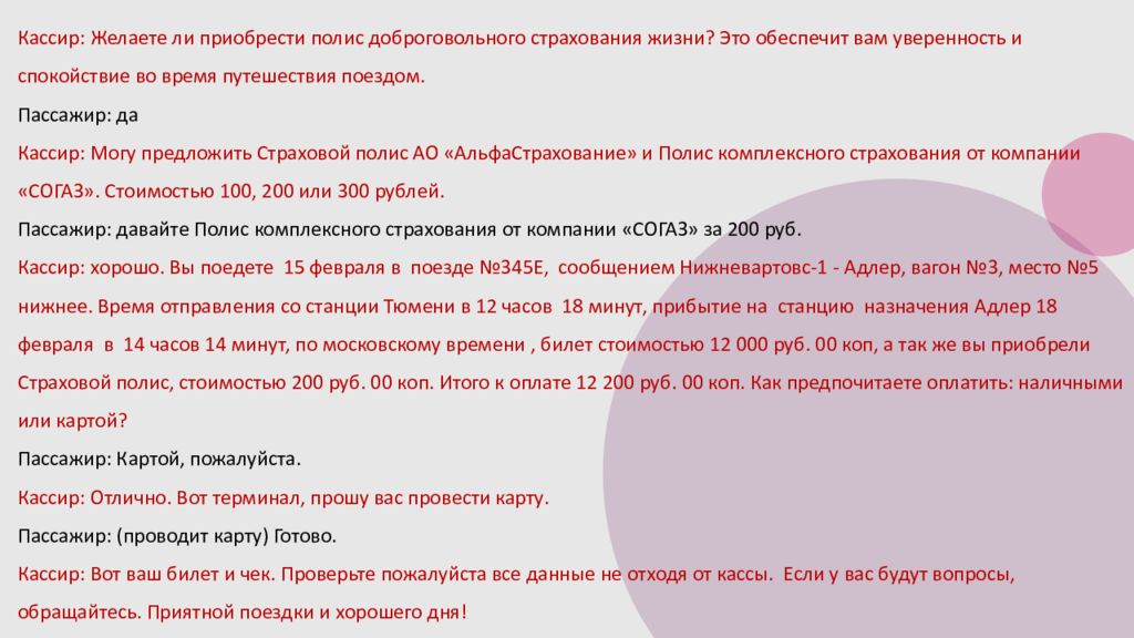 Кассир: Желаете ли приобрести полис доброговольного страхования жизни? Это обеспечит вам уверенность и спокойствие во время путешествия поездом. Пассажир: да Кассир: Могу предложить Страховой полис АО «АльфаСтрахование» и Полис комплексного страхования от компании «СОГАЗ». Стоимостью 100, 200 или 300 рублей. Пассажир: давайте Полис комплексного страхования от компании «СОГАЗ» за 200 руб. Кассир: хорошо. Вы поедете 15 февраля в поезде №345Е, сообщением Нижневартовс-1 - Адлер, вагон №3, место №5 нижнее. Время отправления со станции Тюмени в 12 часов 18 минут, прибытие на станцию назначения Адлер 18 февраля в 14 часов 14 минут, по московскому времени, билет стоимостью 12 000 руб. 00 коп, а так же вы приобрели Страховой полис, стоимостью 200 руб. 00 коп. Итого к оплате 12 200 руб. 00 коп. Как предпочитаете оплатить: наличными или картой? Пассажир: Картой, пожалуйста. Кассир: Отлично. Вот терминал, прошу вас провести карту. Пассажир: (проводит карту) Готово. Кассир: Вот ваш билет и чек. Проверьте пожалуйста все данные не отходя от кассы. Если у вас будут вопросы, обращайтесь. Приятной поездки и хорошего дня!