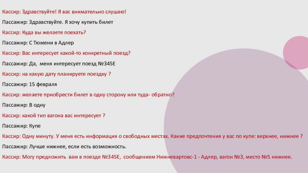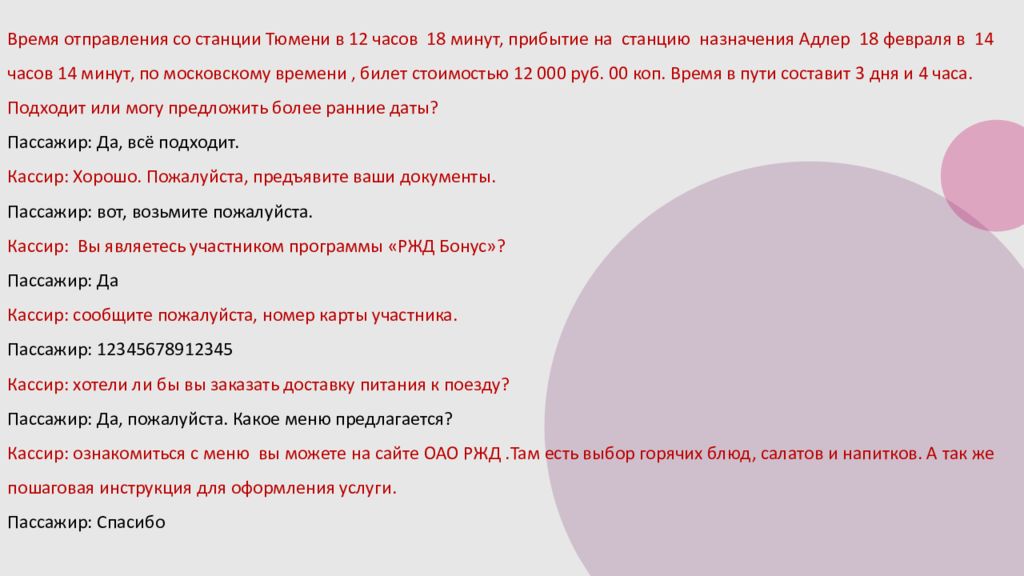 Время отправления со станции Тюмени в 12 часов 18 минут, прибытие на станцию назначения Адлер 18 февраля в 14 часов 14 минут, по московскому времени, билет стоимостью 12 000 руб. 00 коп. Время в пути составит 3 дня и 4 часа. Подходит или могу предложить более ранние даты? Пассажир: Да, всё подходит. Кассир: Хорошо. Пожалуйста, предъявите ваши документы. Пассажир: вот, возьмите пожалуйста. Кассир: Вы являетесь участником программы «РЖД Бонус»? Пассажир: Да Кассир: сообщите пожалуйста, номер карты участника. Пассажир: 12345678912345 Кассир: хотели ли бы вы заказать доставку питания к поезду? Пассажир: Да, пожалуйста. Какое меню предлагается? Кассир: ознакомиться с меню вы можете на сайте ОАО РЖД.Там есть выбор горячих блюд, салатов и напитков. А так же пошаговая инструкция для оформления услуги. Пассажир: Спасибо