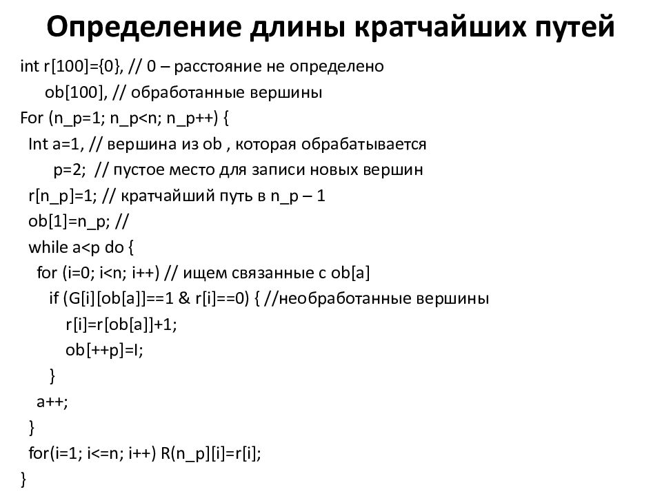 int r[100]={0}, // 0 – расстояние не определено ob[100], // обработанные вершины For ( n_p =1; n_p <n; n_p ++) { Int a =1, // вершина из ob, которая обрабатывается p =2 ; // пустое место для записи новых вершин r[ n_p ]=1; // кратчайший путь в n_p – 1 ob[1]= n_p ; // while a<p do { for ( i =0; i <n; i ++ ) // ищем связанные с ob[a] if (G[ i ][ob[a]]==1 & r[ i ]==0) { //необработанные вершины r[ i ]=r[ob[a]]+1; ob[++p]=I; } a++; } for( i =1; i <=n; i ++) R( n_p ][ i ]=r[ i ]; }