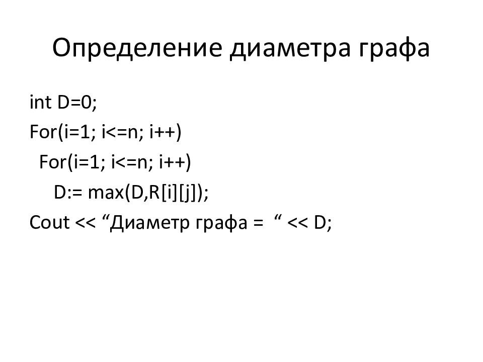 int D=0; For( i =1; i <=n; i ++) For( i =1; i <=n; i ++) D:= max(D,R[ i ][j]); Cout << “ Диаметр графа = “ << D;