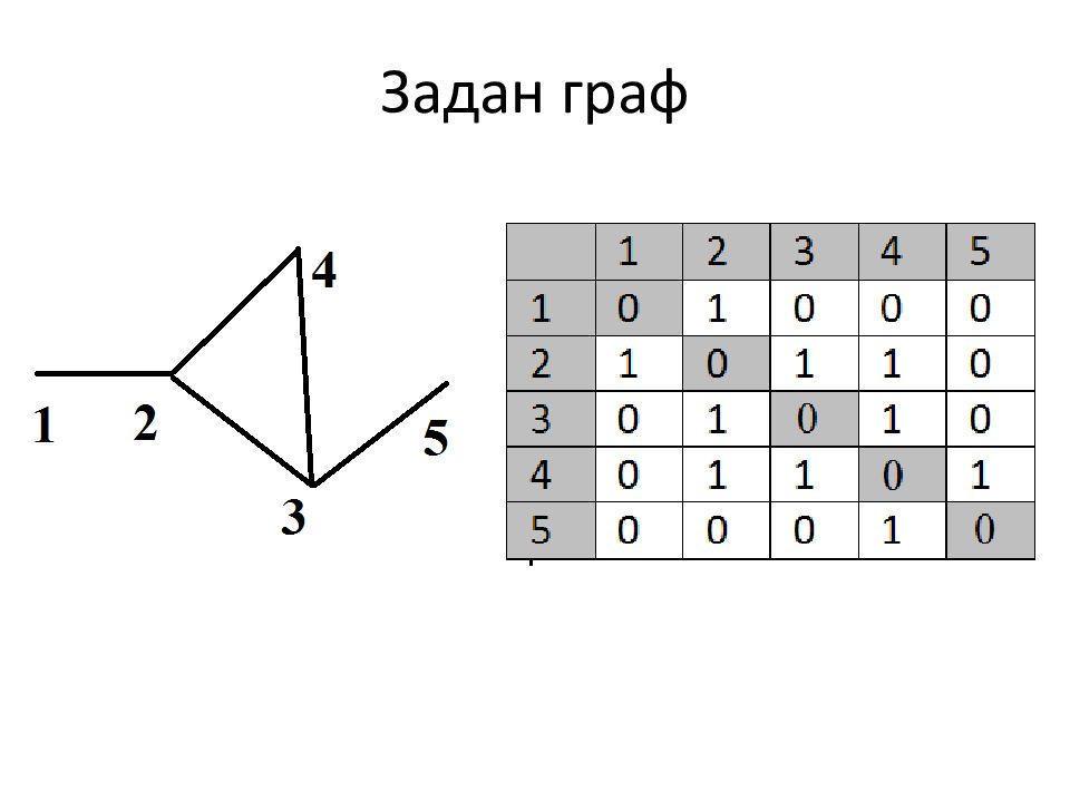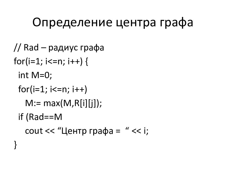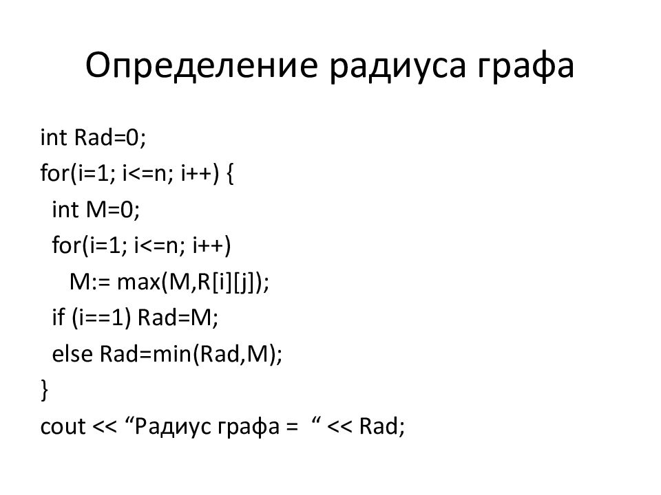 int Rad =0; for( i =1; i <=n; i ++) { int M=0; for( i =1 ; i <=n; i ++) M:= max(M,R[ i ][j]); if ( i ==1) Rad =M; else Rad =min( Rad,M ); } cout << “ Радиус графа = “ << Rad ;