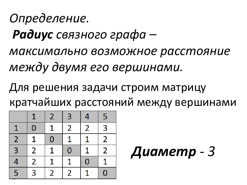 Слайд 7: Определение. Радиус связного графа – максимально возможное расстояние между двумя его вершинами. Для решения задачи строим матрицу кратчайших расстояний между вершинами