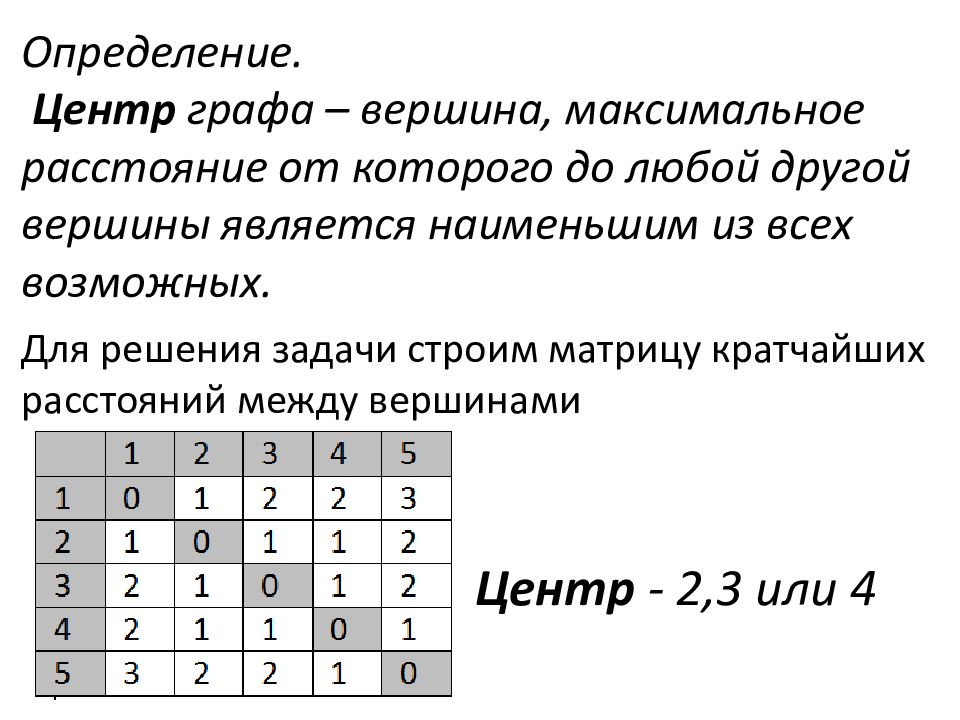 Слайд 9: Определение. Центр графа – вершина, максимальное расстояние от которого до любой другой вершины является наименьшим из всех возможных. Для решения задачи строим матрицу кратчайших расстояний между вершинами