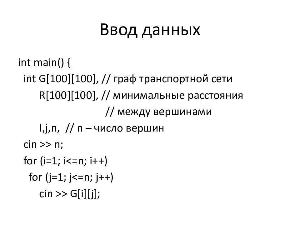int main() { int G[100][100], // граф транспортной сети R[100][100], // минимальные расстояния // между вершинами I,j,n, // n – число вершин cin >> n ; for ( i =1; i <=n; i ++) for (j=1; j<=n; j++) cin >> G[ i ][j];