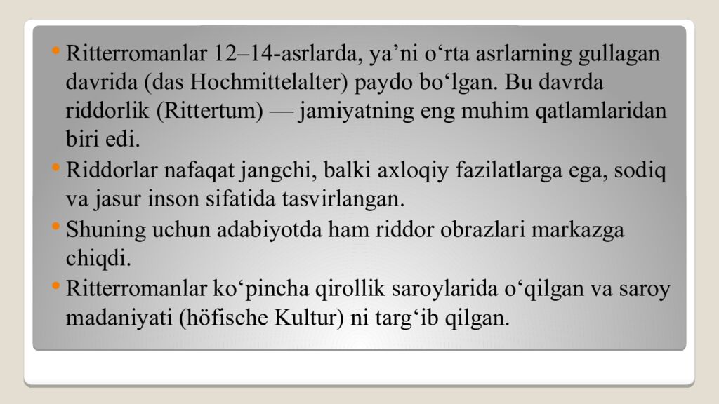 Ritterromanlar 12–14-asrlarda, ya’ni o‘rta asrlarning gullagan davrida (das Hochmittelalter) paydo bo‘lgan. Bu davrda riddorlik (Rittertum) — jamiyatning eng muhim qatlamlaridan biri edi. Riddorlar nafaqat jangchi, balki axloqiy fazilatlarga ega, sodiq va jasur inson sifatida tasvirlangan. Shuning uchun adabiyotda ham riddor obrazlari markazga chiqdi. Ritterromanlar ko‘pincha qirollik saroylarida o‘qilgan va saroy madaniyati (höfische Kultur) ni targ‘ib qilgan.