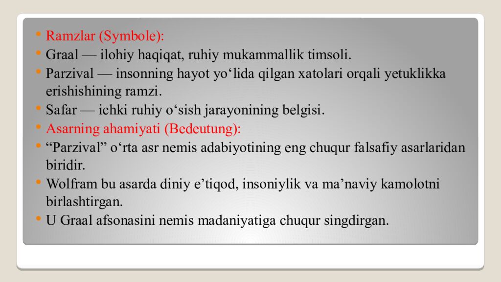 Ramzlar (Symbole): Graal — ilohiy haqiqat, ruhiy mukammallik timsoli. Parzival — insonning hayot yo‘lida qilgan xatolari orqali yetuklikka erishishining ramzi. Safar — ichki ruhiy o‘sish jarayonining belgisi. Asarning ahamiyati (Bedeutung): “Parzival” o‘rta asr nemis adabiyotining eng chuqur falsafiy asarlaridan biridir. Wolfram bu asarda diniy e’tiqod, insoniylik va ma’naviy kamolotni birlashtirgan. U Graal afsonasini nemis madaniyatiga chuqur singdirgan.