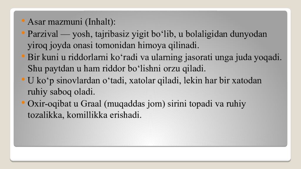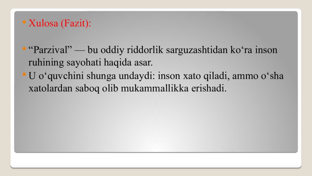 Xulosa (Fazit): “Parzival” — bu oddiy riddorlik sarguzashtidan ko‘ra inson ruhining sayohati haqida asar. U o‘quvchini shunga undaydi: inson xato qiladi, ammo o‘sha xatolardan saboq olib mukammallikka erishadi.