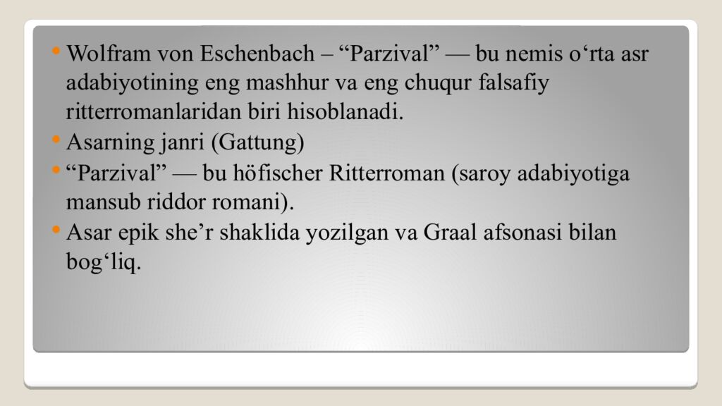 Wolfram von Eschenbach – “Parzival” — bu nemis o‘rta asr adabiyotining eng mashhur va eng chuqur falsafiy ritterromanlaridan biri hisoblanadi. Asarning janri (Gattung) “Parzival” — bu höfischer Ritterroman (saroy adabiyotiga mansub riddor romani). Asar epik she’r shaklida yozilgan va Graal afsonasi bilan bog‘liq.