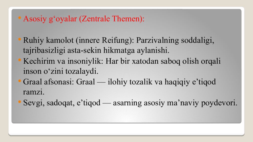 Asosiy g‘oyalar (Zentrale Themen): Ruhiy kamolot (innere Reifung): Parzivalning soddaligi, tajribasizligi asta-sekin hikmatga aylanishi. Kechirim va insoniylik: Har bir xatodan saboq olish orqali inson o‘zini tozalaydi. Graal afsonasi: Graal — ilohiy tozalik va haqiqiy e’tiqod ramzi. Sevgi, sadoqat, e’tiqod — asarning asosiy ma’naviy poydevori.