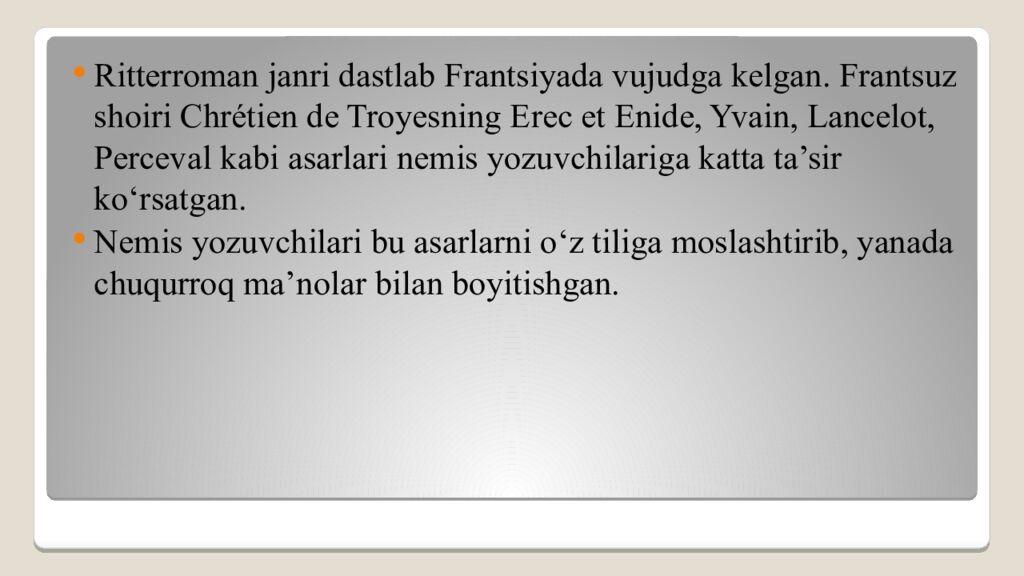 Ritterroman janri dastlab Frantsiyada vujudga kelgan. Frantsuz shoiri Chrétien de Troyesning Erec et Enide, Yvain, Lancelot, Perceval kabi asarlari nemis yozuvchilariga katta ta’sir ko‘rsatgan. Nemis yozuvchilari bu asarlarni o‘z tiliga moslashtirib, yanada chuqurroq ma’nolar bilan boyitishgan.