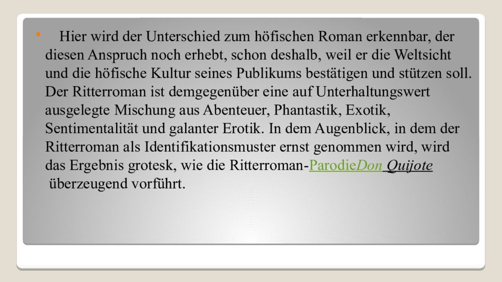 Hier wird der Unterschied zum höfischen Roman erkennbar, der diesen Anspruch noch erhebt, schon deshalb, weil er die Weltsicht und die höfische Kultur seines Publikums bestätigen und stützen soll. Der Ritterroman ist demgegenüber eine auf Unterhaltungswert ausgelegte Mischung aus Abenteuer, Phantastik, Exotik, Sentimentalität und galanter Erotik. In dem Augenblick, in dem der Ritterroman als Identifikationsmuster ernst genommen wird, wird das Ergebnis grotesk, wie die Ritterroman- Parodie Don Quijote überzeugend vorführt.