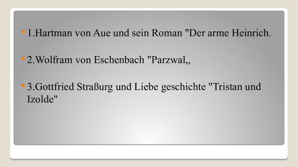 1.Hartman von Aue und sein Roman "Der arme Heinrich. 2.Wolfram von Eschenbach " Parzwal „ 3.Gottfried Straßurg und Liebe geschichte "Tristan und Izolde "