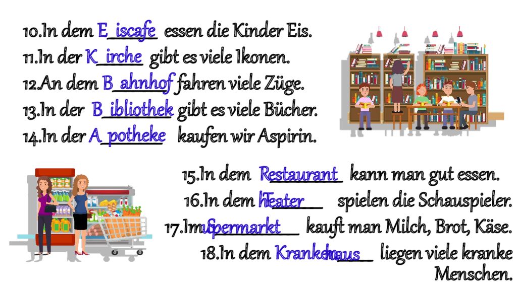 10.In dem E _____________ essen die Kinder Eis. 11.In der K ____________ gibt es viele Ikonen. 12.An dem B ______________ fahren viele Züge. 13.In der B __________________ gibt es viele Bücher. 14.In der A ________________ kaufen wir Aspirin. 15.In dem R ___________________ kann man gut essen. 16.In dem T _____________ spielen die Schauspieler. 17.Im S ______________________ kauft man Milch, Brot, Käse. 18.In dem Kranken _________ liegen viele kranke Menschen. iscafe irche ahnhof ibliothek potheke estaurant heater upermarkt haus