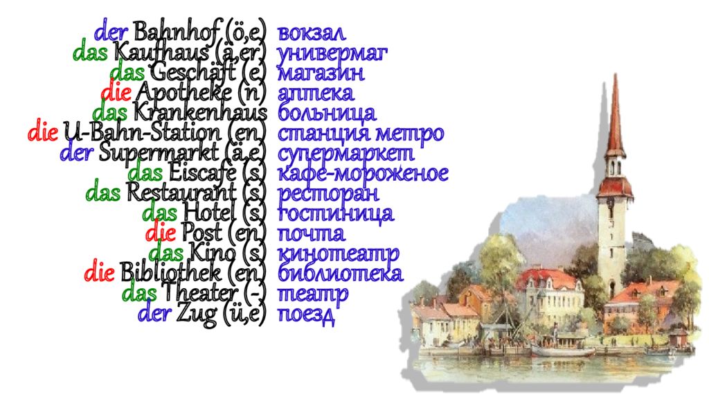 der Bahnhof ( ö,e ) вокзал das Kaufhaus ( ä,er ) универмаг das Geschäft (e) магазин die Apotheke ( n ) аптека das Krankenhaus больница die U-Bahn-Station (en) станция метро der Supermarkt ( ä,e ) супермаркет das Eiscafe (s) кафе-мороженое das Restaurant (s) ресторан das Hotel (s) гостиница die Post (en) почта das Kino (s) кинотеатр die Bibliothek (en) библиотека das Theater ( - ) театр der Zug ( ü,e ) поезд