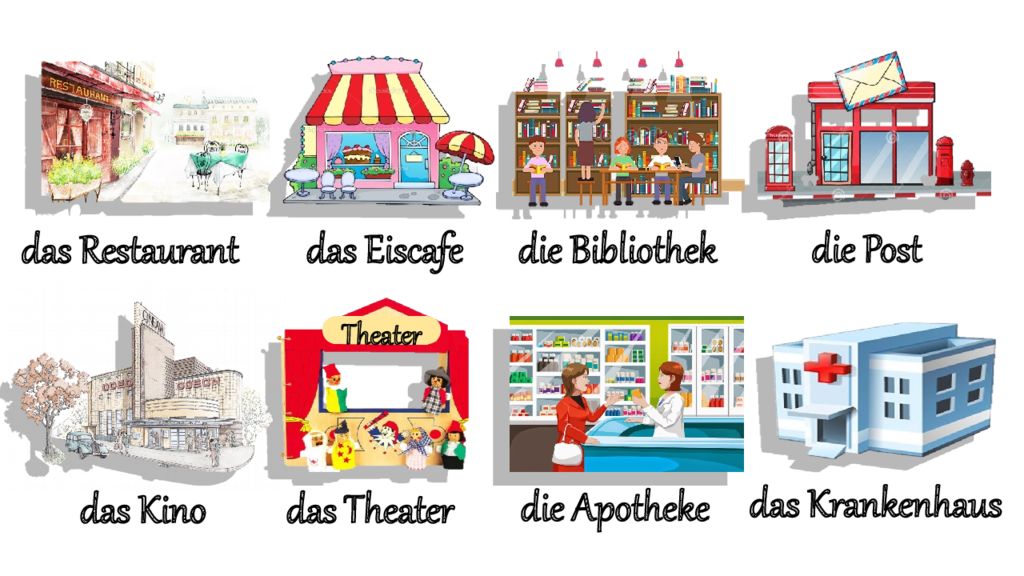 das Restaurant das Kino die Post die Bibliothek das Theater Theater das Krankenhaus die Apotheke das Eiscafe